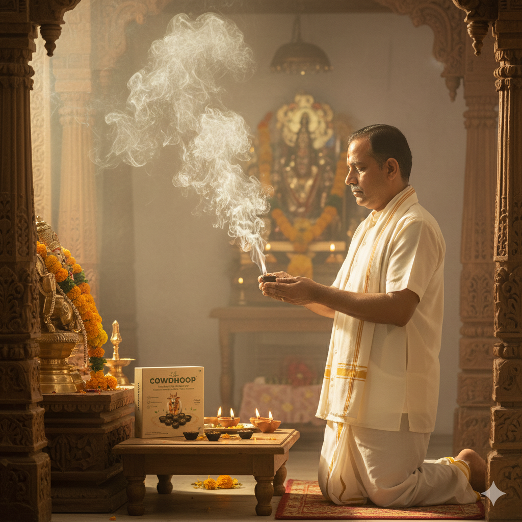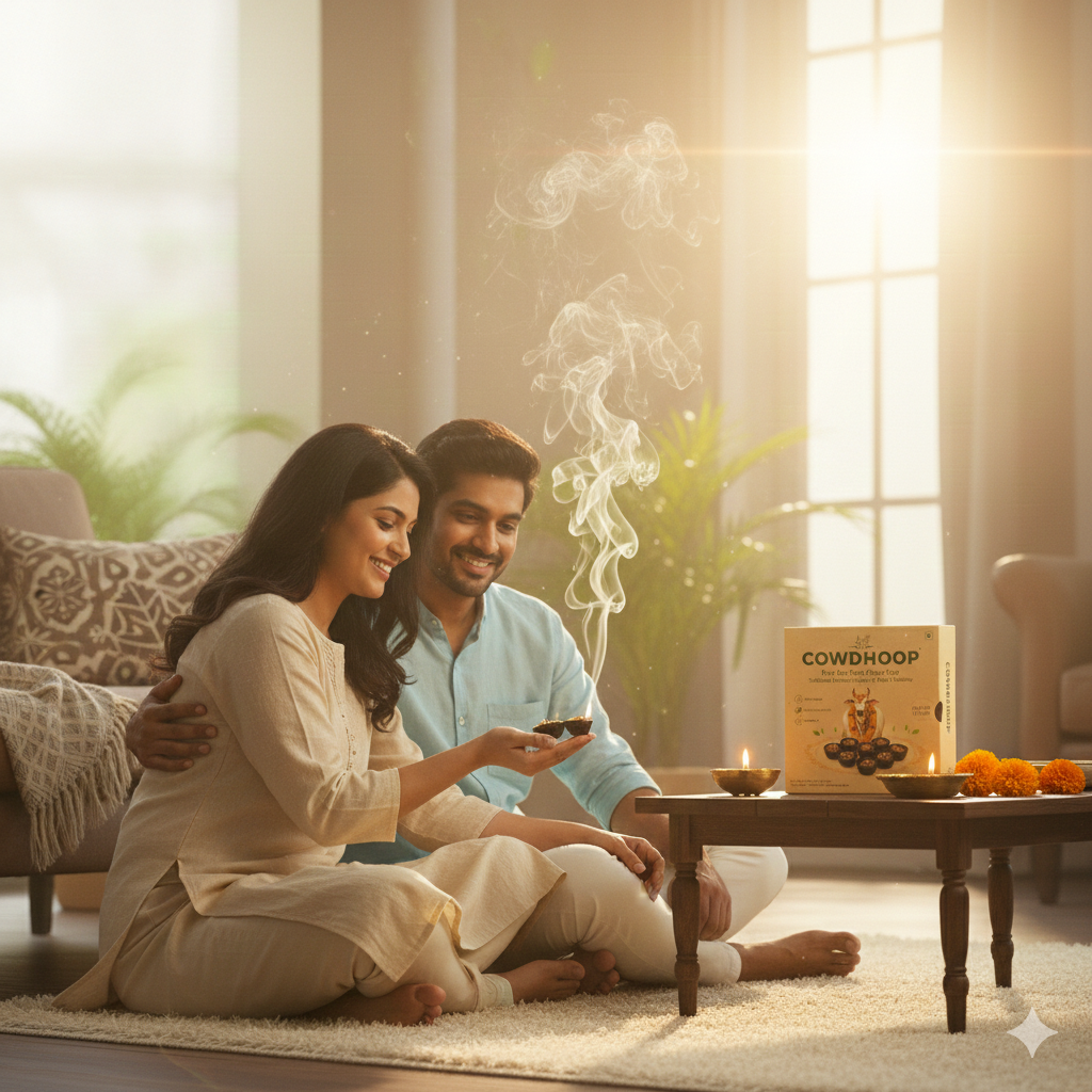✅ Answer: As per traditional belief, cow dung and sambrani incense help purify the surroundings and create a positive, peaceful atmosphere.